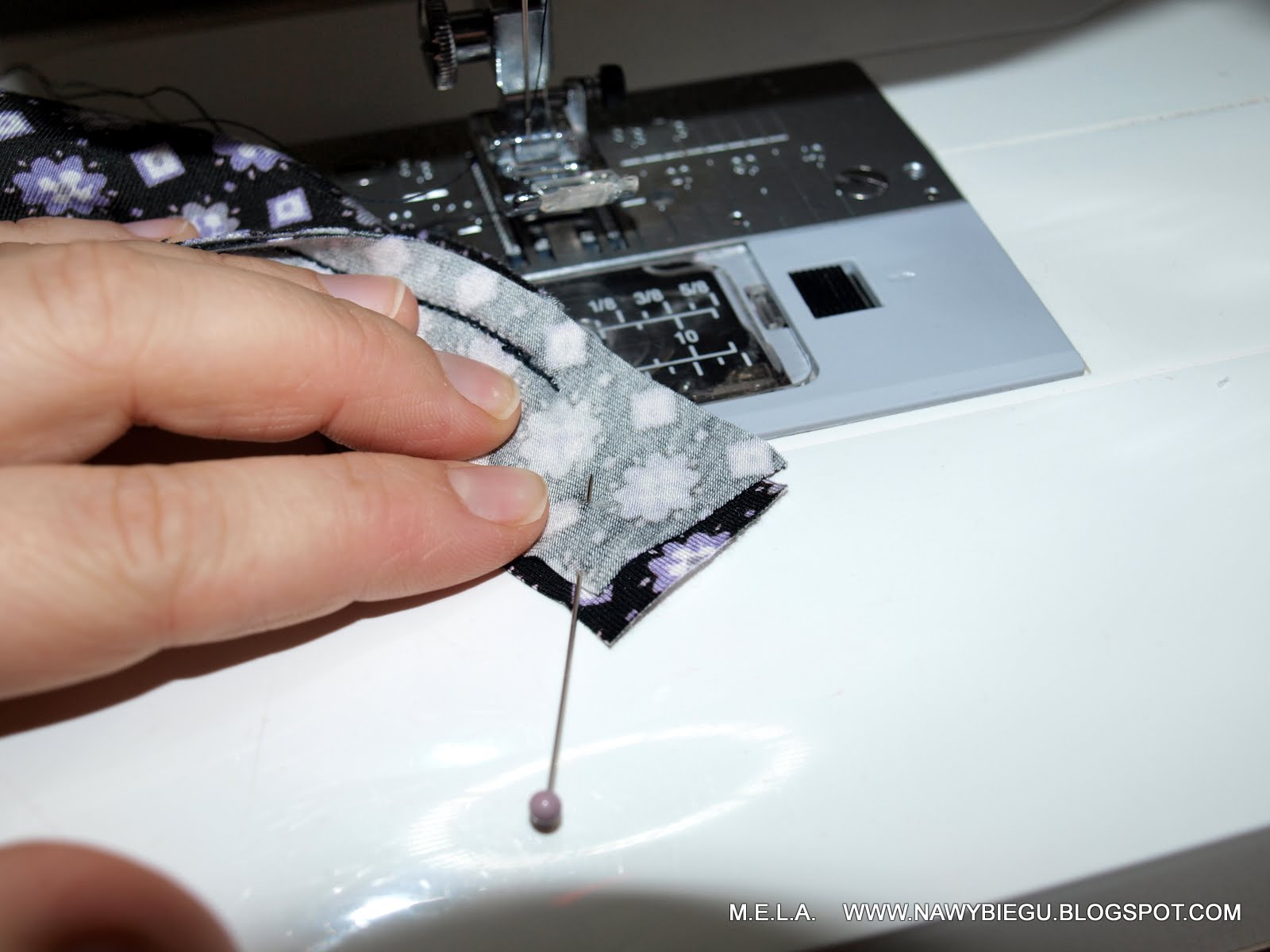 robimy skos, tzn przeszywamy po skosie tworząc szpic w lamówce